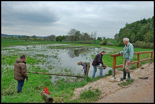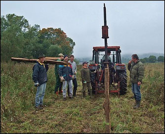 Im Bereich der Alten Badeanstalt wurde die Weidefläche vergrößert. Über 60 Eichenpfähle sowie ca. 900 lfdm. Stacheldraht wurden verarbeitet. Damit kann die Weidefläche für unsere Auerochsenherde