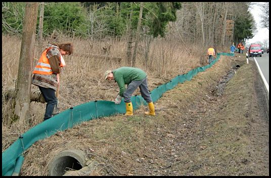 Rechtzeitig hat der Korbacher NABU am 19. März wie jedes Jahr den Krötenschutzzaun aufgestellt. Die aus dem Wald richtung Teich wandernden Tiere stauen sich am Zaun und werden dort spätabends und